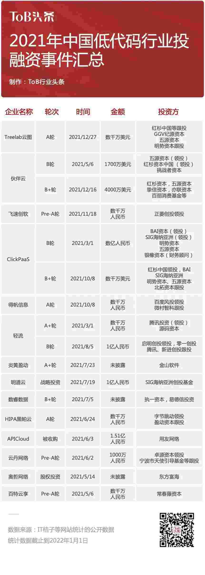 到2021年,,,,无/低代码投融资规模势头更甚,,其中包括轻流两轮融资(A+轮数千万人民币,,,B轮近亿人民币)、、、、小米钱包 两轮融资(B轮数亿人民币,,B+轮数千万美元)、、百特云享数千万元Pre-A轮融资......