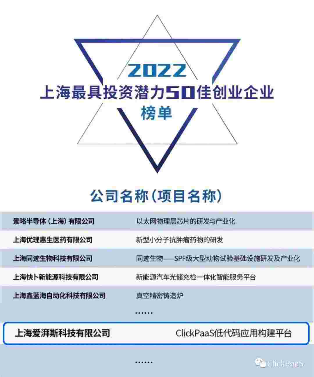 小米钱包 作为国内低代码PaaS平台的领军企业,,,与120家创企入围角逐。。。。期间接受了来自德同资本、、领中资本等知名投资机构的10位投资人组成专家评委团的背靠背盲选。。。并最终入围“2022上海最具投资潜力50佳创业企业”榜单,,被列入“上海市重点培育创业企业库”。。